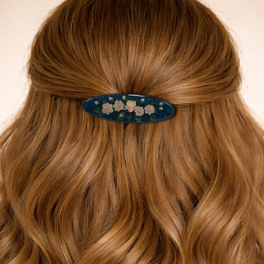 The subtle shimmer behind the floral design adds richness and contrast, allowing the blossoms to stand out while catching the light. A graceful piece of wearable art that brings a touch of garden elegance to any hairstyle.