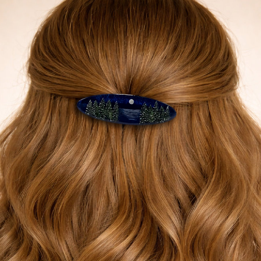 This handcrafted oval barrette features a peaceful Lake Tahoe night scene beneath a deep midnight sky. Moonlight reflects across the water while pine trees frame the shoreline, creating a quiet alpine landscape inspired by Tahoe evenings. The tiny trees and moonlit water are carefully hand-painted in layers and sealed beneath clear resin, giving the scene depth and a smooth glass-like finish that protects the artwork.