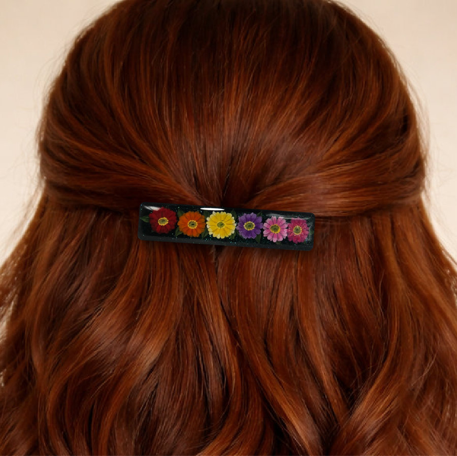 This handcrafted 3.5" barrette features a vibrant row of Gerbera daisies painted in rich garden colors across a sparkling dark green glitter background. Each flower is individually hand-painted with layered petals and soft green leaves. The layered artwork is sealed beneath clear resin, giving the piece depth, shine, and a smooth glass-like finish that protects the painting while allowing the glittering background to shimmer behind the flowers.